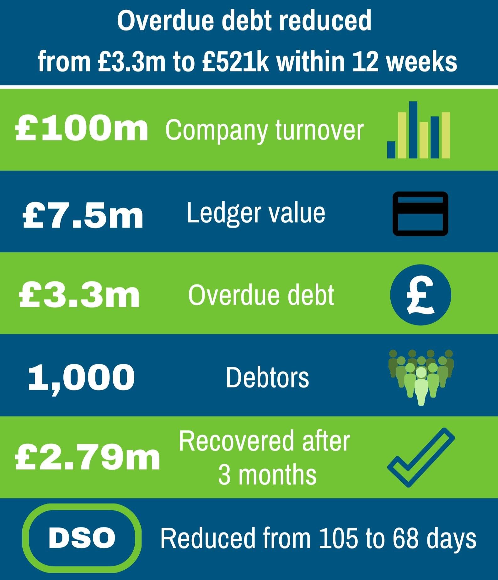 The 120-day-plus debt was reduced from £1.5m to £300k (including 2 legal cases on payment plans) and the overdue debt from £3.3m to £521k.